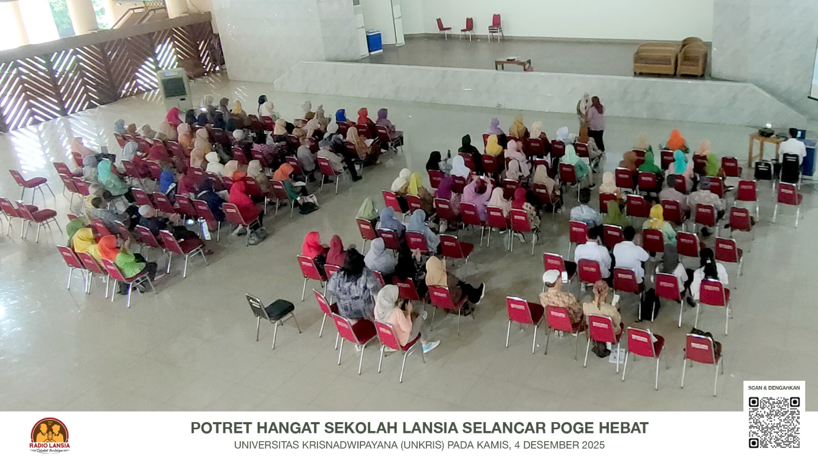 JAKARTA – Suasana ceria dan penuh semangat menyelimuti Pendopo Universitas Krisnadwipayana (UNKRIS) pada Kamis, 4 Desember 2025. Ratusan peserta Sekolah Lansia Selancar Poge Hebat Pondok Gede Standar 1 (S1) berkumpul bukan untuk sekadar bersosialisasi, melainkan untuk menimba ilmu kesehatan dalam sesi pembelajaran bertajuk “Tips Mengenali Tanda, Gejala, dan Pencegahan Hipertensi pada Lansia.”